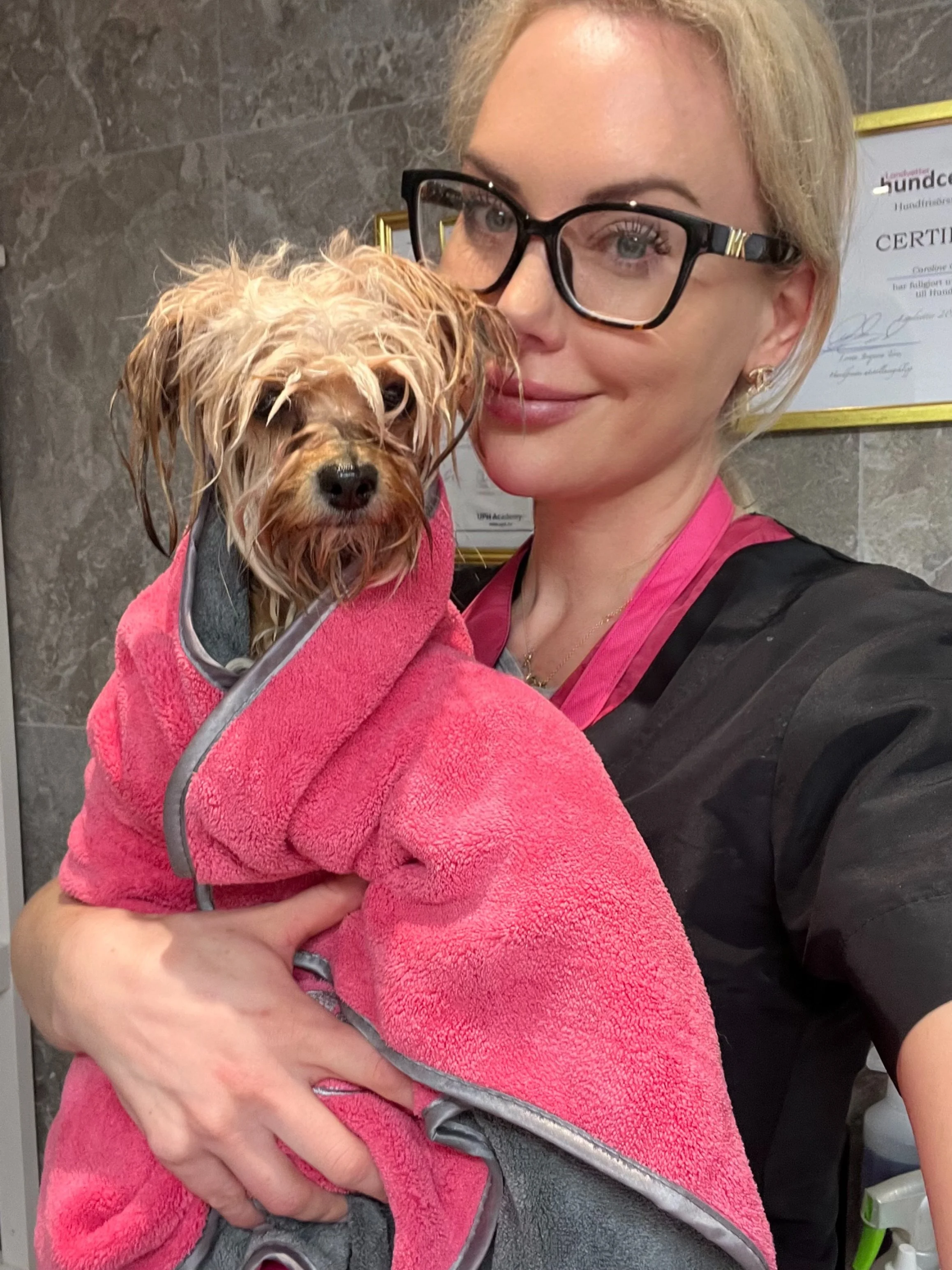 Djuprengörande bad, fön med blaster som på ett skonsamt sätt trycker ut ullen. Behandlingen avslutas med grundlig genomborstning. Från 750 kr / timme.